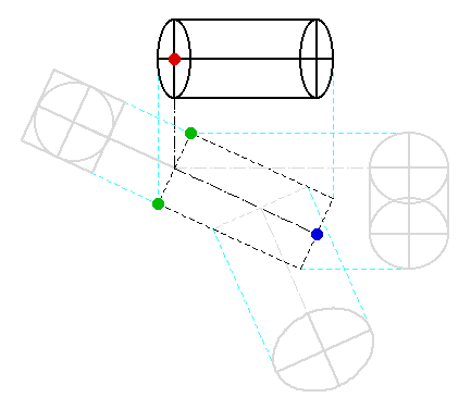 正面図が任意の角度に傾いた長方形になる場合に、4クリックで円柱の上面図を描くことができます。